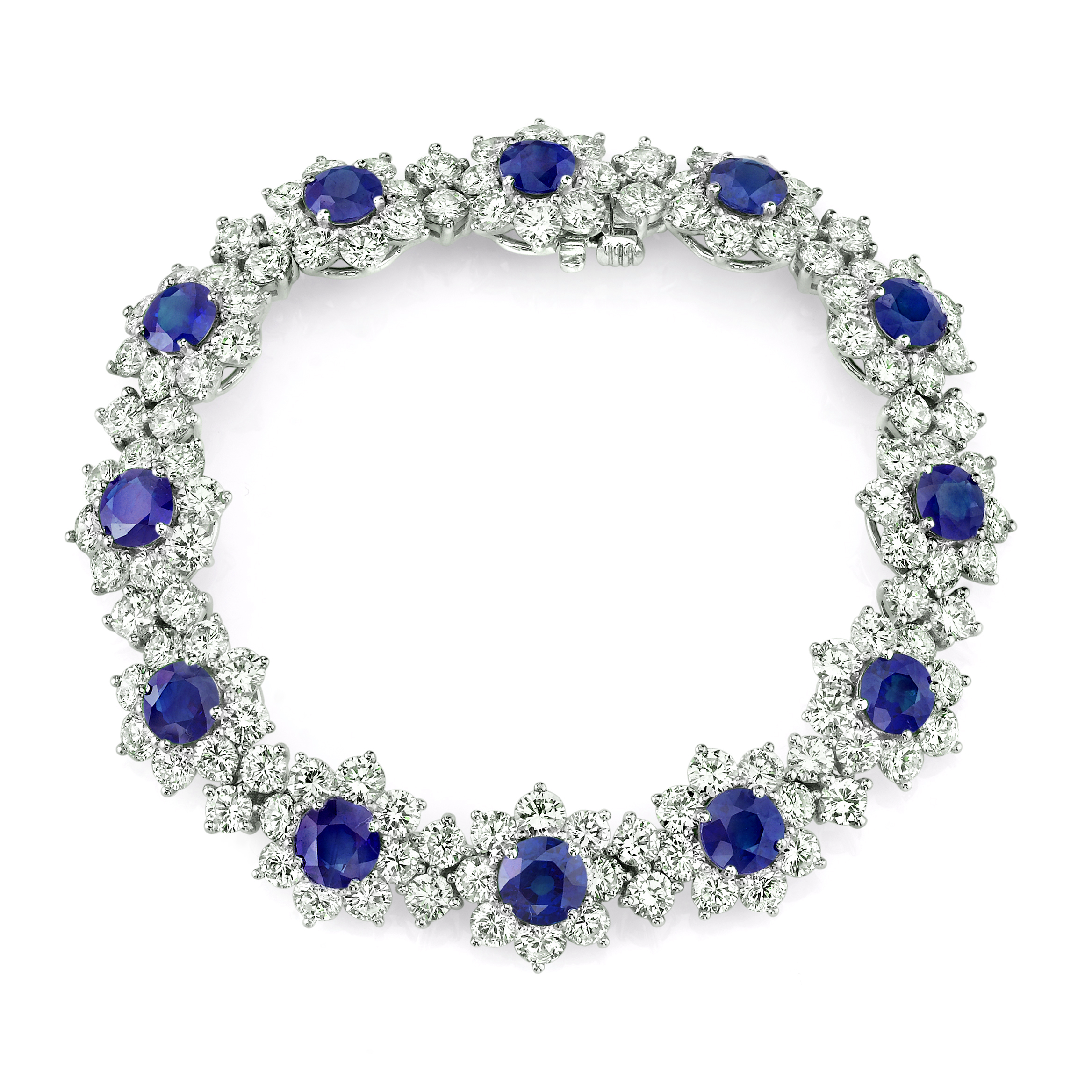 A true statement piece. Twelve round blue sapphires are adorned with floral clusters of dazzling round brilliant cut diamonds. This showstopping bracelet is 7″ in length and set in platinum.