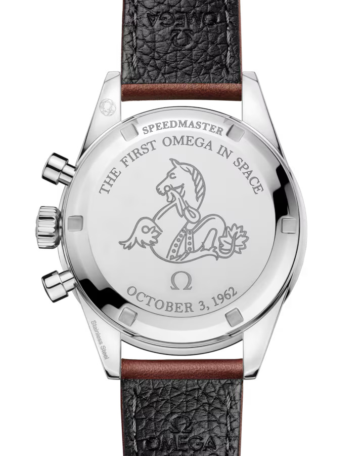 A vintage OMEGA logo is applied on the dial, as well as on the crown, while the caseback features the famous Seahorse medallion, and the engravings, “THE FIRST OMEGA IN SPACE” and “OCTOBER 3, 1962”.