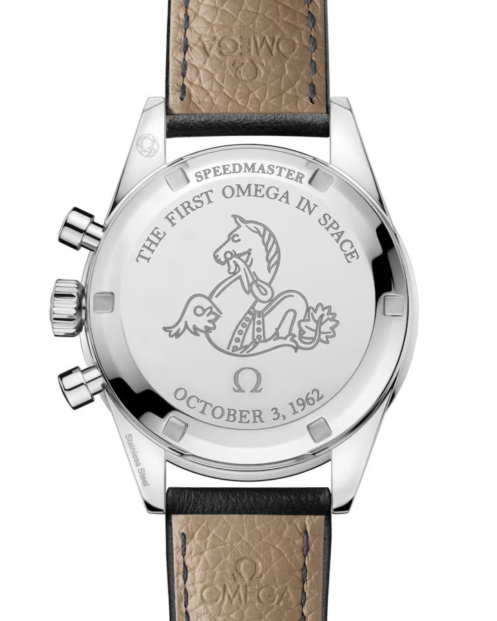 A vintage OMEGA logo is applied on the dial, as well as on the crown, while the caseback features the famous Seahorse medallion, and the engravings, “THE FIRST OMEGA IN SPACE” and “OCTOBER 3, 1962”.